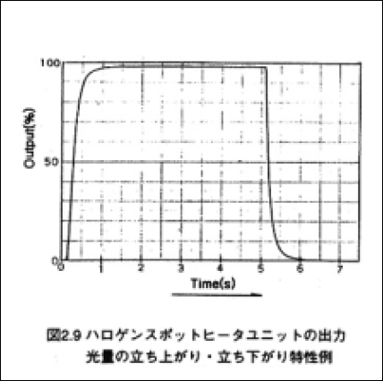 図2.9は、ハロゲンスポットヒータユニットの出力光量の立ち上がり.立ち下がり特性の一例である。ハロゲンランプの定格電圧、定格電力はそれぞれ100V、500Wである。ランプ点灯後1s以内に最大光量に達し、ランプ消灯後は1s以内に光量がほぼ0になる。このように熱源(光源)自身が急速な立ち上がり、立ち下がり特性を持つため、特に断続的な加熱をするような場合には、効率のよい加熱システムを構築することができる。