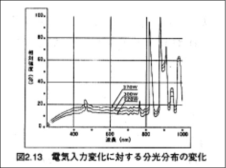 図2.12に示すようにランプの出す可視域でのスペクトル分布が自然昼光のスペクトル分布に非常によく似ており、色温度は約6000Kである。