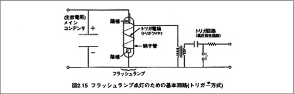 ランプの点灯方法は、通常の白熱電球とは異なる。ランプ内に封入されたXcガスは電気的に絶縁体なので、特別な高電圧発生の回路によりあらかじめ絶縁を破壊し電流の流れる道筋が作られる。あらかじめ直流電流によって充電され蓄えられた主放電用コンデンサ上の電荷は、この道筋に沿って放電しランプが点灯する(基本回路を図2.15に示す)。