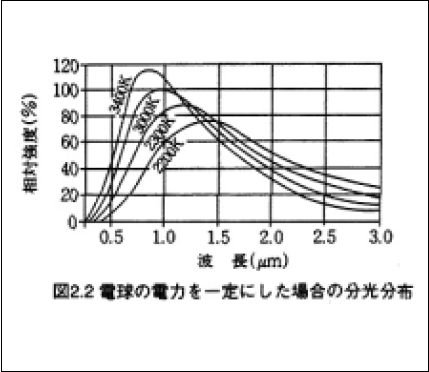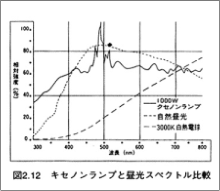 図2.12に示すようにランプの出す可視域でのスペクトル分布が自然昼光のスペクトル分布に非常によく似ており、色温度は約6000Kである。