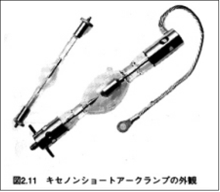 キセノンショートアークランプの外観を図2.11に示す。いずれのランプも球状の石英ガラス製発光管内に陽極および陰極からなる一対の電極を対向して設け、キセノンガスを規定圧力封入したものである。ランプ点灯中にはその温度上昇により内部圧力が数十気圧にもなるため、十分に強固な気密を保つことが必要になる。