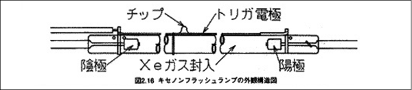 ランプの点灯モードには2種ある。繰り返して点灯する際、点灯を容易にするために常時微少の予備電流を流し電気的な導体に保ち容易に主放電ができるようにした方式(シマ一方式)と、予備電流がなく点灯のたびに高電圧をかけて気体を絶縁破壊して点灯させる方式(トリガ方式)がある。予備電流の有無によりランプ構造が多少異なるが、ここでは我々が多く扱っている後者のトリガ方式のランプに例をとり述べる。ランプの外観構造の例を図2.16に示す。