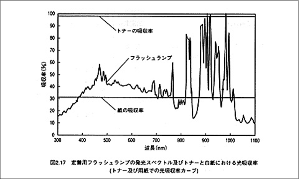 トナーを溶かすのに必要なエネルギーの絶対測定は容易ではない。そのため、ランプへの入カエネルギーで評価する方法が今まで取られてきた。また、照射される紙の面積によっても必要量が変わるので、面積当たりに換算した値が用いられる。対象とするトナー特性、光学系によって、また上記光パルス幅によっても異なるが通常は1.5〜2.2J/cm2で定着ができる6)