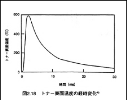 フラッシュ光で加熱された時のトナー表面温度の時間変化の代表例を図2.184)に示す。それに見るようにトナーの加熱は通常msecのオーダーでなされる。加熱時間はほぼフラッシュ光の波形に対応する。