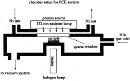 図1に光エッチング装置のチャンバ概観図を示す。チ ャンバはターボ分子ポンプで1×10-5Torrまで排気できる。チャンバ上部にエキシマランプ(λ=172nm:ウシオ電機製)を取り付け、フランジの合成石英窓を通してチャンバ外から紫外光を照射する。試料表面での強度は約3mW/cm2である。ランプとフランジの間は常にN2ガスを流す。これは酸素による強度の減衰を妨ぐためである。また、試料台はハロゲンランプで140°Cまで加熱できる。