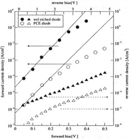 図5に光エッチングおよびウェットエッチングで作製したSchottkyダイオードのI-V特性を示す。ウエットエッチングで作製したダイオードに比較して、光エッチングで作製したダイオードはリーク電流が約1桁低減されているのが分かる。Schottky障壁高さおよびn値についても、ウェットエッチングダイオードの0.61eVおよ び1.68に比較して、光エッチングダイオードでは0.72eVおよび1.57と改善された。これは光エッチングの比較比が高く、光エッチングによってInAlAs表面に与える損傷がウェットエッチングと同等あるいはそれ以下であることを示している。また、この光エッチングと連続的に光パッシベーションを行うSchottkyダイ オードの特性はさらに改善された7)