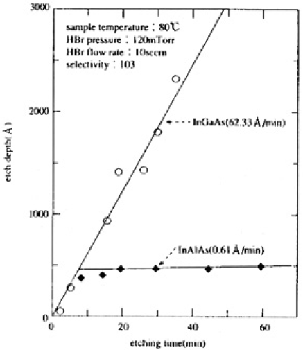 InGaAsおよびInGaAs/InAlAsを光エッチングした時のエッチング深さとエッチング時間の関係を図2に示す。InGaAsおよびInAlAsのエッチング速度は、それぞれ62.33Å/minおよび0.61Å/minとなり、選択比は103となった。これは、これまで報告された中でもかなり高い値である。