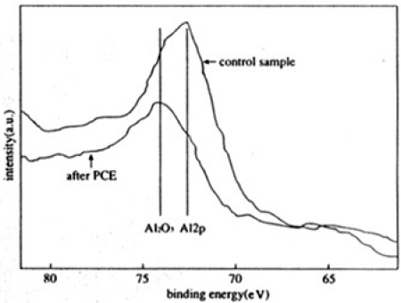 103という高い選択比が生じる原因を調べるため、光エッチング後の表面をXPSで調べた。その結果を図3に示す。図3より光エッチング後にAl2O3が形成されていることが分かる。Al2O3は高い融点を持つために、表面で形成されると脱離が進まなくなってしまう。このAl2O3はチャンバ内に残留した、あるいはHBrガス不純物の酸素によって形成されると考えられる。同様の説明がS.AgarwalaらのHBrを用いたRIE2)およびS.KurodaらのCH3Brを用いた光エッチング4)でも報告されている。