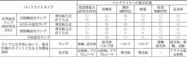 ノートパソコンやビデオカメラなどに用いられる直視形のLCDバックライトには、LCDの特徴を生かすために、低消費電力、薄形、軽量、高輝度などの性能が 要求される。これら要求仕様と直視形バックライトとして用いられる光源と光学系について特徴などを表1示す。