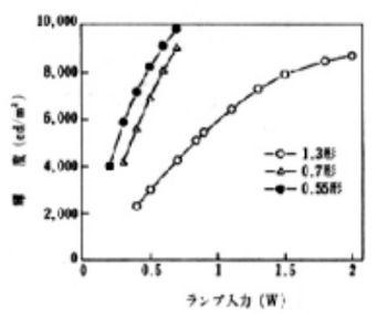 小型蛍光ランプでは、高輝度を得るために、バルブ径毎の条件の最適化を行ってきた。参考までに冷陰極蛍光ランプの輝度と発光効率のバルブ内径依存性を図3に示す。現時点では、発光効率は定格電流5mAにおいて飽和しつつあるが、発光効率の低下は生じていない。平面蛍光ランプの輝度のランプ入力依存性を図4に示す。