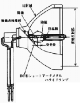 図5は、投写形のバックライトの構造例を示したものである。反射鏡(放物面鏡または楕円面鏡)に光源であるショートアークメタルハライドランプ(以下、ランプと略す)が、光軸上の焦点位置近傍に位置するように無機系接着剤で固定されている。ランプは、点灯方式によりAC形とDC形に分けられるが、近年では安定器の小形化、コスト低減、および光源のちらつき防止と寿命改善を目的としたDC形が主流になりつつある8)。通常DC形ランプは、陰極輝点輝度が陽極輝点に比べ大きい、発光管の陰極側に、最冷部防止のための保温膜が塗られているなどの理由により、電極が太い陽極側に反射鏡側に取り付けられる。