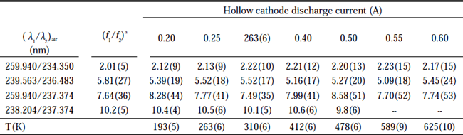 For the normalized lineshape, g(ν-ν0), we assume a full Voigt profile. The Lorentzian contribution is assumed to be primarily due to radiative (natural) broadening. The temperature of the atoms in the discharge is found by finding the best overall consistency in absorption measurements for several wellknown UV line pairs at each current used in the hollow cathode discharge.