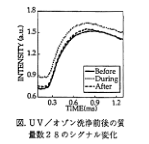 実験結果の一例(質量数28、CO+、N2+,C2H4+)を右図に示す。UV/オゾン洗浄を行う前にパルス状のシグナルが現れているが、これはO2 フリージェットの中の不純物窒素による ものと思われる。次にこのシグナルを洗浄中のシグナルと比べてみると、その波形はほとんど変わらないまま全体のシグナル強度が上昇していることが分かる。このことからUV/オゾン洗浄中の表面でのCOの生成反応は、紫外光によりO2 ビーム中に生成された酸素原子の供給には律速されず、表面に吸着した酸素原子と有機物の化学反応が律速過程となっているものと考えられる。