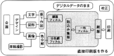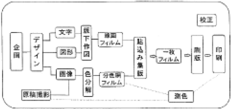 まず、はじめに印刷がどのような工程を経て、最終的に印刷物になっていくかを図1に示しました。企画・デザインがあって、印刷物に入れる原稿の作成や、画像の決定をします。次に、図形や文字を手や写植機で入力し、これらを合成したり貼り付けたりして、一つの版にして印刷するというのが基本的な流れになります。