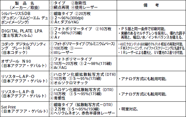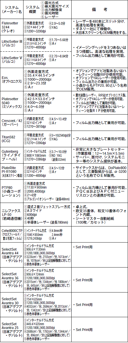 1990年代に入って、特に2~3年前からは、レーザーの能力・材料の開発力等のアップによりCTPが実用機としてどんどん出てきています。CTPの方式は、使用する版の材料により、①フォトポリマー版方式、②銀塩(写真乳剤・・・写真と同じようなもの)印刷版方式、③ 電子写真(コピーマシンのようなもの)版方式、④転写版方式、⑤直描(インクジェット)版方式など、いろんな種類の方式に大きく分けられます。これらの版に合わせて、アルゴン、YAG、半導体といったレーザーが使われます。さらに走査方式も、フィルムの装置によってドラムタイプ(内面走査・外面走査)や平面タイプのものがあります。これらをまとめたのが表2・表3ですが、世界各国で非常にたくさんの種類のシステムが発表されていることが分かると思います。