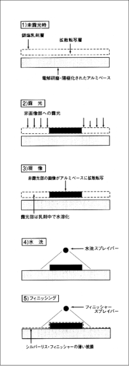 熱で透過して転写層をアルミ基板に転写するものです。この方式では、転写したところがインキの付く部分になります。