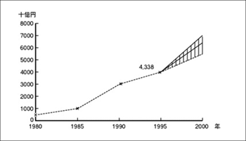 光部品のうち約50%(6270億円)がディスプレイ素子、約15%(1910億円)が発光素子、約10%(1270億円)が受光素子である。光産業の伸び率は1995年度の前年比6.8%であり電子工業の伸び率(年平均0.1%)を大きく上回り、光産業は今後も情報化、マルチメディア社会を支える基幹産業として成長していくと考えられ、図1-2に示すように2000年には5兆5 千億円~7兆1千億円になるとの試算もある1)。