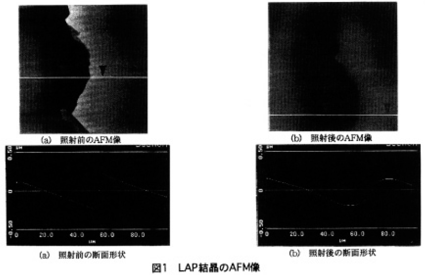 光源として投入電力約20Wのヘッドオン型XeおよびArエキシマランプ(ウシオ電機製)を用いた。発光中心波長はそれぞれ172nm(7.2eV)および126nm(9.8eV)である。10 Torr.の空気中、およびAr雰囲気中で、約12m/cm2の照度でサンプル結晶に照射した。サンプル結晶としては、劈開したLAP(L-arginine phosphate monohydrate)、LHBF(l-histidine terrafluoriborate)の単結晶を用いた。照射前後の表面状態の変化を、主にAFMを用いて観察した。