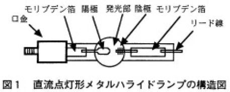 メタルハライドランプは金属ハロゲン化物と水銀と稀ガスを封入した高(蒸気)圧放電灯(=HIDランプ)である。点灯方法は数年雨までは矩形波交流電力による点灯だけであったが、長寿命で且つ点灯回路も安価になる直流電力に依る点灯方式のランプが筆者らに依って開発され1) 2)、急速に普及している(交流点灯はDIRECT CURRENTの頭文字をとってDC点灯とも言われ、またDCランプとも呼ぶ。DCランプに対し、交流点灯形のランプはACランプである)。