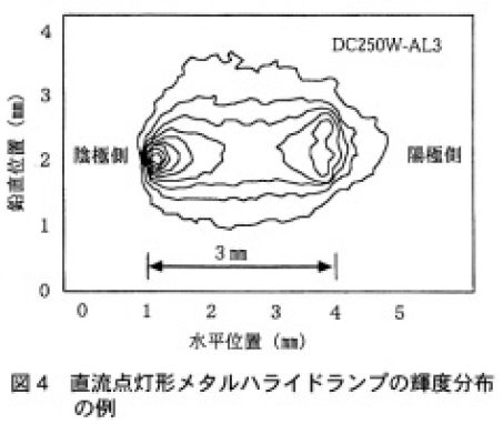 図4はアーク長3mmの直流点灯形250Wランプの相対輝度分布の測定例である。輝度等高線は陰極の全面の最大輝度値を100としたときの10%刻みの等高線である。