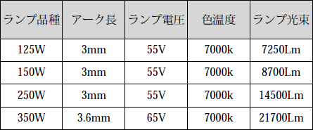 現在製品化されている直流点灯形ランプの代表的なものを表1に示す。中心品種はアーク長3mm近辺で125W、150W、250W、350Wの4品種であるが 各品種ともプロジェクターメーカーの要望を考慮して電力やアーク長を微調整したランプも生産されている。例えばプロジェクターの設計コンセプトに応じて150Wランプを155Wに、250Wランプを260W、270W、280Wなどに、350Wを400Wにそれぞれ入力変更したり、またアーク長3mmを2.8mm、2.5mmなどに短縮したランプなど生産されている。ここで注意を要することは入力電力やアーク長を変更すると、それに適合した点灯回路を開発する必要があり、コスト高になったり、開発期間が必要となることである。特に電力の増加とアーク長の短縮は共にランプ電流が増える方向であり、点灯回路のコストの増大要因になる。