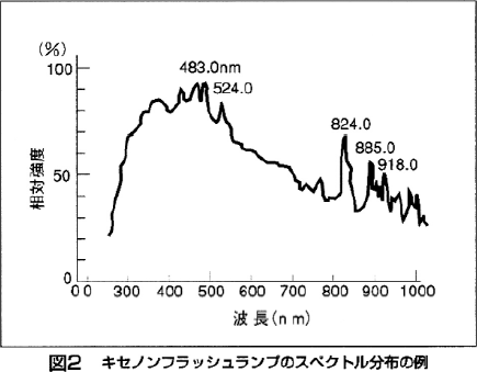 a.フラッシュランプ……このランプは紫外線硬化に使用されてから長い年月が経過している。しかし冷熱光源としての良さがまだ充分認識されていないのでここで説明しておく。交流電源からの電流を整流し、コンデンサー:の充電に使う。十分充電した後主としてキセノンガスを封入したランプを通して瞬時に放電する。この充電・放電を一定の周期で繰り返す。瞬時ではあるが大電流がランプ中を流れるためガス温度は一万度前後にまで上昇する。そのためガスは黒体に似た放射を行う。ウィーンの変位則によれば放射強度の最大になる波長λmと温度Tの関係は