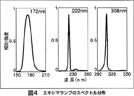 b.エキシマランプ……エキシマランプは封入ガスに応じて図4に示すようにほぼ単色光(単一波長域の光)のみを放射する。発光管の温度は100°C以下である。発光ガス・蒸気(以下ガスと略す)は一対の誘電体壁に囲まれた空間内に封入されている。電極はこの封入物と反対の誘電体外表面に取付けられる。従って電極は放電ガスとは接触しないので無電極型のランプである。外部から電極に印加した電圧と封入ガスに接した内表面に存在する電荷の作る静電界によってガス中に絶縁破壊が生ずる。電荷はガス中の電界によって加速されながらもう一方の電極に接した誘電体の内表面に到達し、そこで蓄積される。電圧を反転すれば同じような放電が生ずる。この放電は0.1µs程度の極短時間で終了する。そのため放電の初期過程のみしか存在せず、電子密度の著しい増加が生ずる前に放電は停止してしまう。308nm光を放射するXeCl*エキシマランプは主用途はUV硬化である。水冷によって発光管、封入ガスの温度を上げないで電気入力密度を数10W/㎝に上げ、かつ印加電圧波形を最適化し、発光効率を高める研究がなされている。この他KrCl*(222nm)、Xe2*(172nm)も商品化されている。特にXe2 *は低圧水銀ランプの185nmと共に真空紫外域(200-100nm)の代表的なランプである。これもXeCl*と同様な方策で放射出力の増大が研究・開発されている。ランプ長1㎝当たり5W程度の172nm光を取出すのが究極の目標となろう。