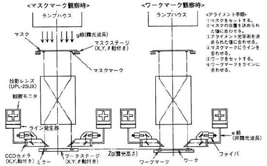 従来の密着露光方式,プロキシミティ露光方式では,マスクワーク間の干渉稿とワークのアライメントマークをマスク越しに観察することで,ワークのアライメントマークのコントラスト低下が,アライメント精度に影響を与えていた。