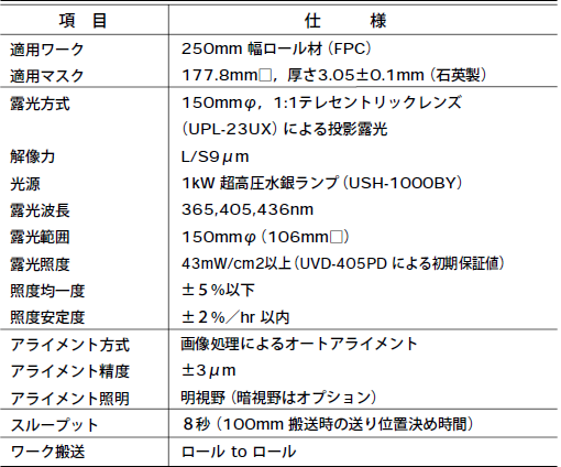 なお,これまで,リジッド基板用装置の話をしてきたが,T-BGAを主用途としたロール材(FPC)の露光装置の引き合いも増えてきた。リジッド基板同様,露光方式に投影露光を採用,搬送はロールto ロールで自動搬送するタイプ「UX-4023SR」もラインナップとして揃えている(写真3,表2)。