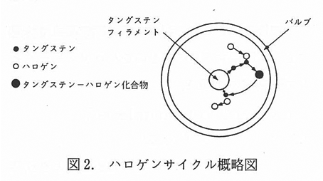白熱電球は,発熱体(個体)を電流によって白熱状態に加熱し光を放射する.ふつう白熱電球には,高融点(約3400°C)のタングステンフィラメントが使われる.タングステンは高融点であるが,蒸発はすでに融点以下で始まりこれによってフィラメントはやせ細り,最終的にはやがてある位置で切れてしまう.これが白熱電球の寿命である.また,ランプのバルブ内壁には蒸発したタングステンが付着していくため,黒化が起こり外部に放射される光がだんだん減少し,その減少は20%近くにも達する.このような,タングステンの蒸発を防止し黒化をなくして,長寿命化を図るためにハロゲンガスが有効であることが判明した.