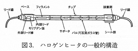 ハロゲンヒータも,封入ガスに微量のハロゲンガスとアルゴンや窒素などの不活性ガスを用いた赤外線電球である.封入されたハロゲンと加速蒸発するタングステンとの再生循環反応(ハロゲンサイクル)の効果によりバルブを小型にしても黒化が起きず,寿命も延ばせる.ハロゲンヒータの一般的構造を図3 に示す.