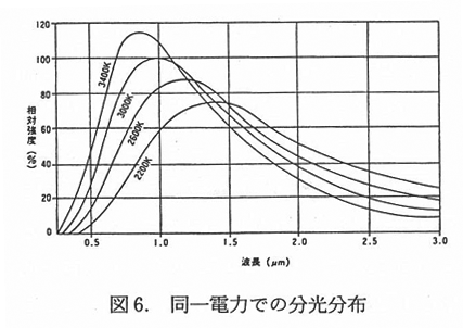 図6 に同一電力でランプの色温度をパラメーターにした分光分布を示す.これらの分光分布はプランクの放射法則(式1)に近似している.また,各分布のピーク波長は色温度が高くなるほど短波長側ヘシフトする.一般的にハロゲンヒータでは色温度を2500Kあたりに設計したものが多い.このピークを与える波長と色温度との関係は式2 で示せる.