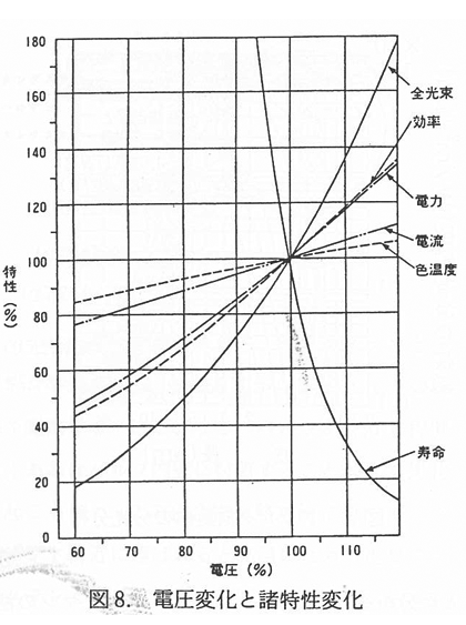 以上は赤外線放射の諸法則と絡めて,ハロゲンヒータの分光分布について述べた.次にハロゲンランプの電圧変化に対する諸特性の変化について述べる.ハロゲンランプにおいては,各特性の変化率(F/F0)は電圧の変化率(V/V0)に対して,近似的に式3 の関係がある.この関係を図にしたもの図8 に示す.