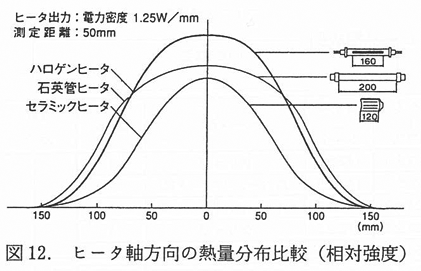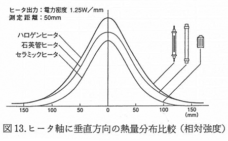 一般に赤外線ヒータは,石英管の中にニクロム線を発熱体としてコイル状にして納めた構造をしている.発熱体は石英管に密封されてなく,また石英管と接触しているため,赤外線は発熱体で加熱された石英管より放射されている.このため,放射効率は60%と低い.シースヒータも通常はステンレス管の内部にコイル状に成形した抵抗発熱体を保持し,両者の隙間は酸化マグネシウムなどの絶縁物を封入したものである.その表面からはその温度や材質に応じた赤外線が放射されるので広く利用されている.しかし,抵抗発熱体によりステンレス等の金属を加熱する上,金属表面からの放射が大きくなり,放射効率は約50%程度と低い.ただし,金属管表面に高い赤外線放射率の物質層を形成させた製品も開発され,放射効率を改善したものもある.面状のセラミックヒータも同様にセラミックスからの2 次放射になるため,放射効率は50%程度になってしまう.これらの赤外線ヒータに対して,ハロゲンヒータは前述のように85%以上の放射効率を有している.図12,13 に熱量分布の相対強度を示す.
