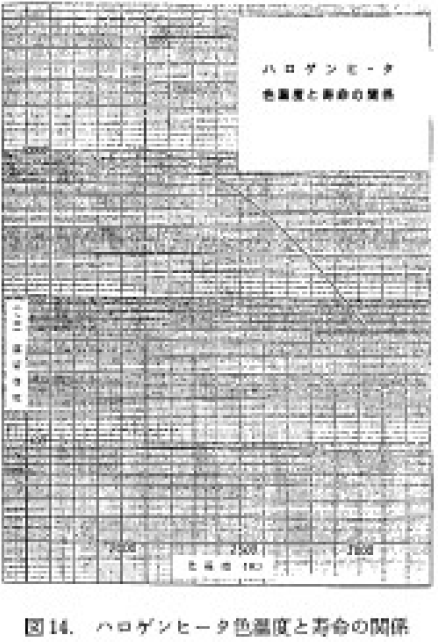 ハロゲンサイクルにより,完壁な再生循環作用が得られれば寿命は無限のものとなる.しかし,バルブ内部での熱対流やフィラメントの微妙な温度勾配等により,蒸発したタングステン原子がもとの位置に再生しないため有限の寿命になってしまう.一般的なハロゲンヒータの色温度と寿命との関係を図14 に示す.なお,最近では色温度を高く設計した場合でもこれ以上に寿命を延ばせる技術が開発されている.ただし,寿命は点灯中のバルブ温度にも影響される.温度限界としては,下限はハロゲンサイクルが機能する温度の250°C付近で,上限としては800°C付近である.これより高温になるとバルブ(石英ガラス)に吸蔵されている不純ガスなどの放出があり,黒化を早めたり早期に断線が起こるなどの影響がでる.したがって,高温になる場合はバルブの強制空冷より太いバルブの使用などが必要になる場合がある.