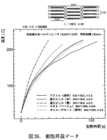 特に最近においては,樹脂加熱成形分野におけるハロゲンヒータの需要が強まってきている.また,金属鋼板やさらには今までは,遠赤外線ヒータでの加熱が主体であったガラス,紙の製造分野にまで近赤外線ヒータであるハロゲンヒータが使用されるようになってきた.最後に,ハロゲンヒータを用いて様々な材料を加熱実験することにより得られた,各種材料の加熱昇温データについて紹介しておく.