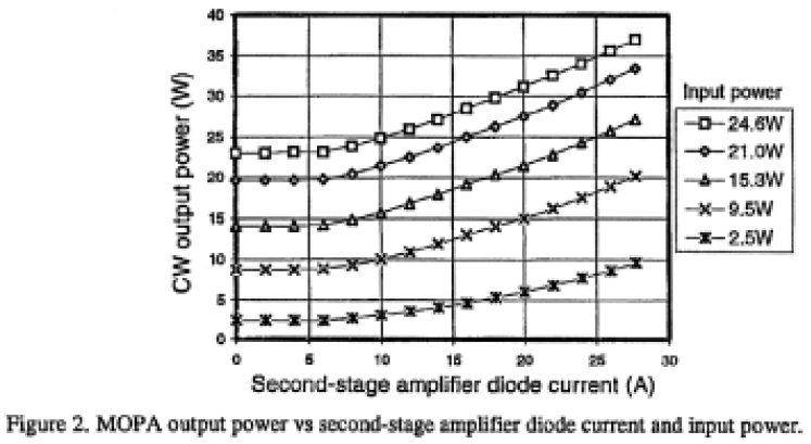 The system used in these experiments incorporates two gain modules amplifying a standing wave acousto-optically, Q-switched oscillator (a slightly modified SEO MPS-1047 resonator design). The CW output curve for this MOPA system is shown in Figure 2 as function of input power to the second amplifier stage and diode current applied. As can be seen the MOPA is capable of producing 37W CW. When Q-switched at a repetition rate of 5kHz, the system generates 29-W average power. The entire MOPA system occupies an 18-inch by 24- inch breadboard. Included on Figure 1 are the output powers of each stage of the MOPA system.