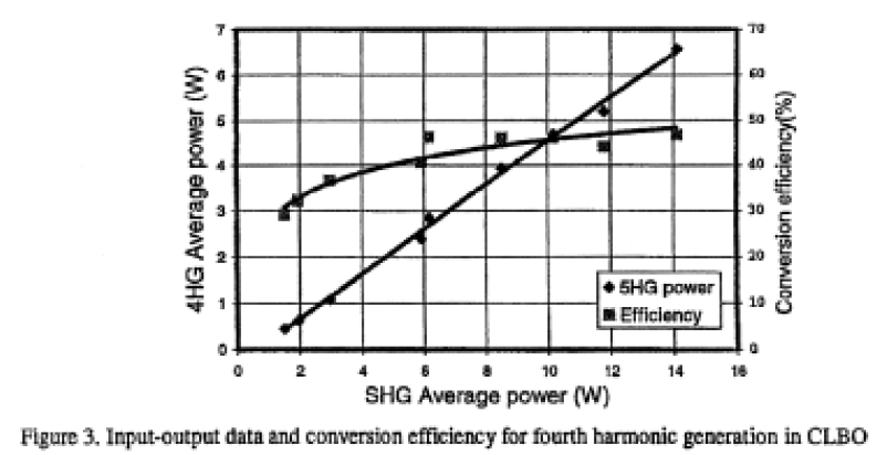 The green output was frequency doubled in CLBO to generate fourth harmonic at 262 nm without additional focusing optics. The CLBO crystals were grown by USHIO using a top seeded growth method. We used two uncoated crystals cut for type- 1 phase matching with lengths of 15 and 20 mm. The measured average power at 262 nm was 4.6W and 5.1W for the 15-mm and 20-mm length crystals respectively. Taking into account reflection losses at the surfaces of the harmonicseparating prism and at the fourth harmonic (4HG) crystal surface, this corresponds to 6.1W and 6.6W generated internally inside the crystal respectively. Power readings were taken only after they had stabilized i.e. after the crystal had thermally equilibrated (which typically was after a few minutes). Figure 3 shows the average power and energy conversion efficiency for the fourth harmonic generation as a function of input power at 523.5nm. The conversion efficiency of input fundamental to fourth harmonic output was 25%.