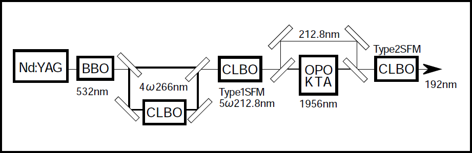 ArFエキシマーレーザ波長域のコヒーレント光を個体レーザとその波長変換技術を用いて発生することを試みた(図1).Nd:YAG5倍波とOPOからの2.09μmとをType2CLBOを用いて和周波混合することによって波長193nmを得る方式である。10Hz動作で1.3mj/pulseの191.98nm光を得た。