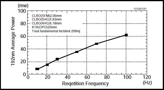 この時,投入した前基本波エネルギーは300mj/pulse,Nd:YAG5倍波31mj/pulse,OPO出力(idler)3.3mjであった。OPO出力波長が1.96μmと読み取れたので全述の終段和周波波長(波長計による計測値)は妥当である。なお,OPOは1064nm pumpingでType2KTAを使用した。図2に192nm光の周波数特性を示す。100Hz動作時に平均出力62mWを得た。しかし,1パルス当たりの出力エネルギーはこの時の10Hz動作の場合に比べ約27%減少した。thermal dephasingの影響と考えられる。Nd:YAG5倍波からの変換効率の改善にはOPOの波長幅,和周波段の波長許容幅,空間的mode matching,optical delayなどの詳細検討が必要である。
