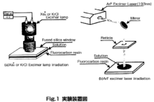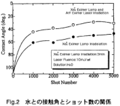 Fig.1 に実験装置図を示す。Fig.1-(a)の様に、フッ素樹脂表面に水あるいはホウ酸水溶液を滴下し、その上から合成石英ガラスを被せ、毛細管現象を利用して薄液層を形成させる。そして垂直方向よりXe2*あるいはKrCl エキシマランプ光を照射する。その後Fig.1-(b)の様に、合成石英ガラスをはずし新たに水あるいはホウ酸水溶液をランプ照射部分だけに滴下する。そして垂直方向よりArF エキシマレーザー光を照射することによりフッ素樹脂の表面改質を行った。Fig.2 に反応溶液に水を用いて改質した改質表面と水との接触角測定の結果を示す。ArF エキシマレーザーのみを照射した場合、エネ ルギー密度25mJ/cm2、6000 ショットで水との接触角が約30°Cであるのに対して、Xe2*エキシマラン プの照射時間3 分、レーザーエネルギー密度10mJ/cm2、3000 ショットの時、エキシマランプ光のみが照射された場所の水との接触角は約50°Cまで、さらにエキシマレーザー光が照射された蜴所は約30°Cまで向上することが明らかとなった。