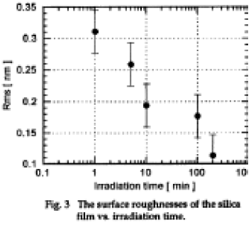 また、膜の成長速度は約0.8nm/min 程度であり、200 分のオペレーションで約160nm の膜が形成できた。Fig.2 にそのサンプル 表面のAFM 像を示す。Fig.3 には薄膜表面の自乗平均あらさ(Rms)の照射時間特性を示す。照射開始から200 分の間に表面らさは時間とともに減少する傾向にあり、200 分後には照射前の水晶基板の表面あらさの値0.134nm に近い値になっていることがわかる。さらにJIS 規格の光学面がRms≦0.5nm であることから、この薄膜が光学面として十分滑らかであることもわかった。