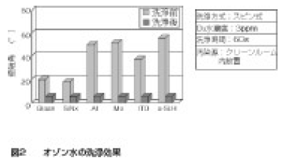 有機汚染物のオゾン水での洗浄効果については図2のとおりであり、これくらい洗浄できれば使用に耐えられる。絶縁膜上での有機物については、除去する有機物の種類や汚染の状態により、オゾン水では除去効果の低い場合もある(図3)。ガラスの場合、目安としては20°C以下では洗浄できるが、30°Cを超えると除去されにくい。はっきりしたメカニズムはわからないが、ガラス基板の伝導性が影響しているのではないかと考えられる。