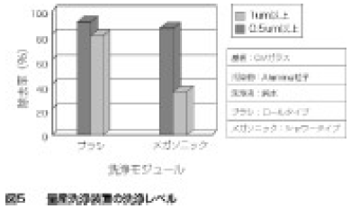 量産洗浄装置の洗浄モジュール別に洗浄効果を説明する(図5)。1µm以上と、0.5µm以上の二つのレベルで考える。0.5µm以上では、ブラシとメガソニックそれぞれで洗浄効果が下がるが、特にメガソニックで結果が悪い。しかし、電解イオン水と同時にメガソニックを適切な条件で使用することで、洗浄効果は大幅に上がる。