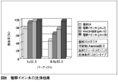 電解イオン水の洗浄効果について他の三つの洗浄溶液との比較で示す(図6)。四つの溶液を比較すると、このように性能に差がでる。特に0.5µm以上では差が著しい。