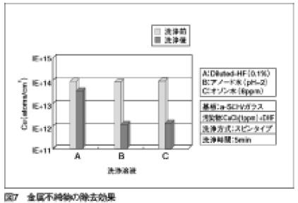 金属不純物の除去効果について図7 に示す。アノード水、オゾン水と比較してHFは除去しにくいことがわかる。半導体と違い、a-Siでは金属不純物を除去することは非常に難しい。HFとオゾン水の混合液に解があるのかもしれないが、a-Siではいかに金属汚染をさせないようにするかが製造のポイントになるのであろう。