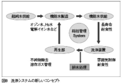 機能水を積極的に使った洗浄システムの概念図を示す(図8)。ここでは効率よく機能水を製造することが鍵となる。機能水にはその配管部分に長寿命、耐食性といった問題があるので、それらを考慮した配管システムを用いなければならない。洗浄装置については雰囲気制御、耐食性といった課題を考慮する。また、再生部を設けて不純物の除去、溶液ガスの制御を行い、そこから再度機能水装置に再生したものを送る。もちろん、これらは総括して制御する。