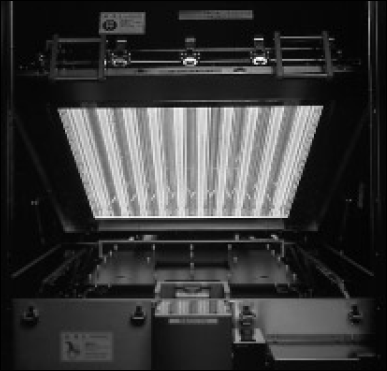 基本構造を図.3に、610mm×690mmの窓を持つ照射装置を写真.1に示す。金属ブロックに設けた複数本の溝にエキシマランプを固定する。金属ブロックは水冷できるように冷却水の流路を備えており、ランプは金属ブロックを介して水冷される。ランプとランプの間には山形のミラーが設けてあり、窓面の照度分布を均一にすると同時に、光を有効に取出す働きをしている。ランプ、金属ブロック、山形ミラーは外気と隔離するため金属容器内に収められ、容器内はエキシマ光の吸収の少ない気体(窒素)で満たされている。ランプ前面にはエキシマ光を効率良く透過する窓ガラス(合成石英)が設けてあり、窓ガラスよりエキシマ光が照射される。