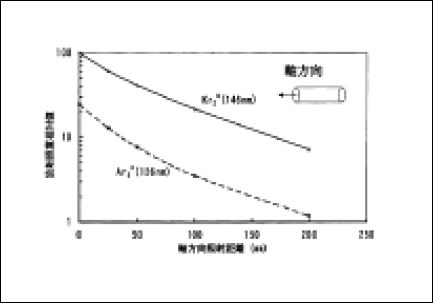 放射照度分布測定はモニタをランプ窓面より所定の距離に配置し、ランプ軸に垂直に移動させて分布を測定した。また、放射照度の距離依存特性を測定する際には、ランプ軸方向にモニタを移動させて測定した。放射照度分布の測定結果を図.5に、放射照度の距離依存特性の測定結果を図.6に示す。Ar2*、Kr2*エキシマランプ共に同じ放射照度分布を示した。窓面外周部の放射照度が高くなっているのは、ランプ構造に由来する。中空ランプ構造であるため窓面中心の放射照度が低くなってしまう。