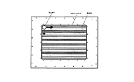 測定方法の概要を図.8に示す。窓面に専用照度モニタを接触させながら移動させて照度の分布を測定した。230mm×230mmの開口窓を持つ8インチウエハ用Xe2*エキシマ光平面光源の放射照度分布の測定結果を図.9に示す。照度のバラツキは約±10%であった。放射照度が強くなっている部分はランプとランプの間である。放射照度分布を均一化するための山形ミラーの効果によるものである。
